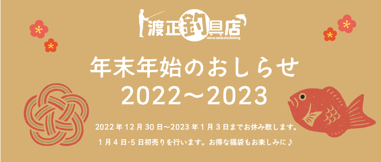 平素は渡正釣具店をご愛顧頂き、誠にありがとうございます。 誠に勝手ながら、年末年始休業日を下記の通りとさせていただきます。 休業期間:2022年12月30日(金)‐ 2023年1月3日(火) 2023年1月4日(水)より …