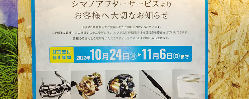 お知らせ盛りだくさんです!! シマノアフターサービスのお知らせです。 10月24日〜11月6日までシステム変更に伴い、修理の受付を停止します。システム移行期間は修理対応を停止するとのこと。お気を付け下さい⚠ …