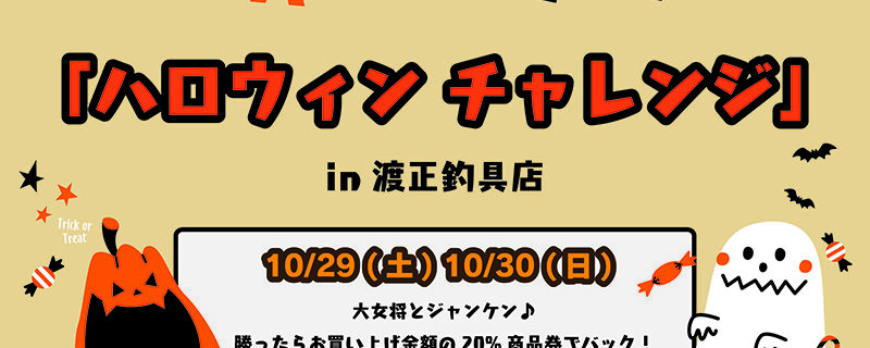 10月29日(土)〜30日(日)2日間、 渡正釣具店では『ハロウィン チャレンジ!』を開催します!なんと最大25%バック!! 大女将とジャンケンをして勝ったら、お買上げ金額の20%を当店商品券でバック!! 負けても、10 …