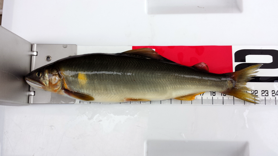 スケールのメモリに鮎の尾がかかるように撮影し、