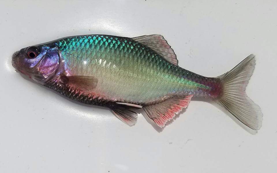 (婚姻色に色づいたキタノアカヒレタビラ)