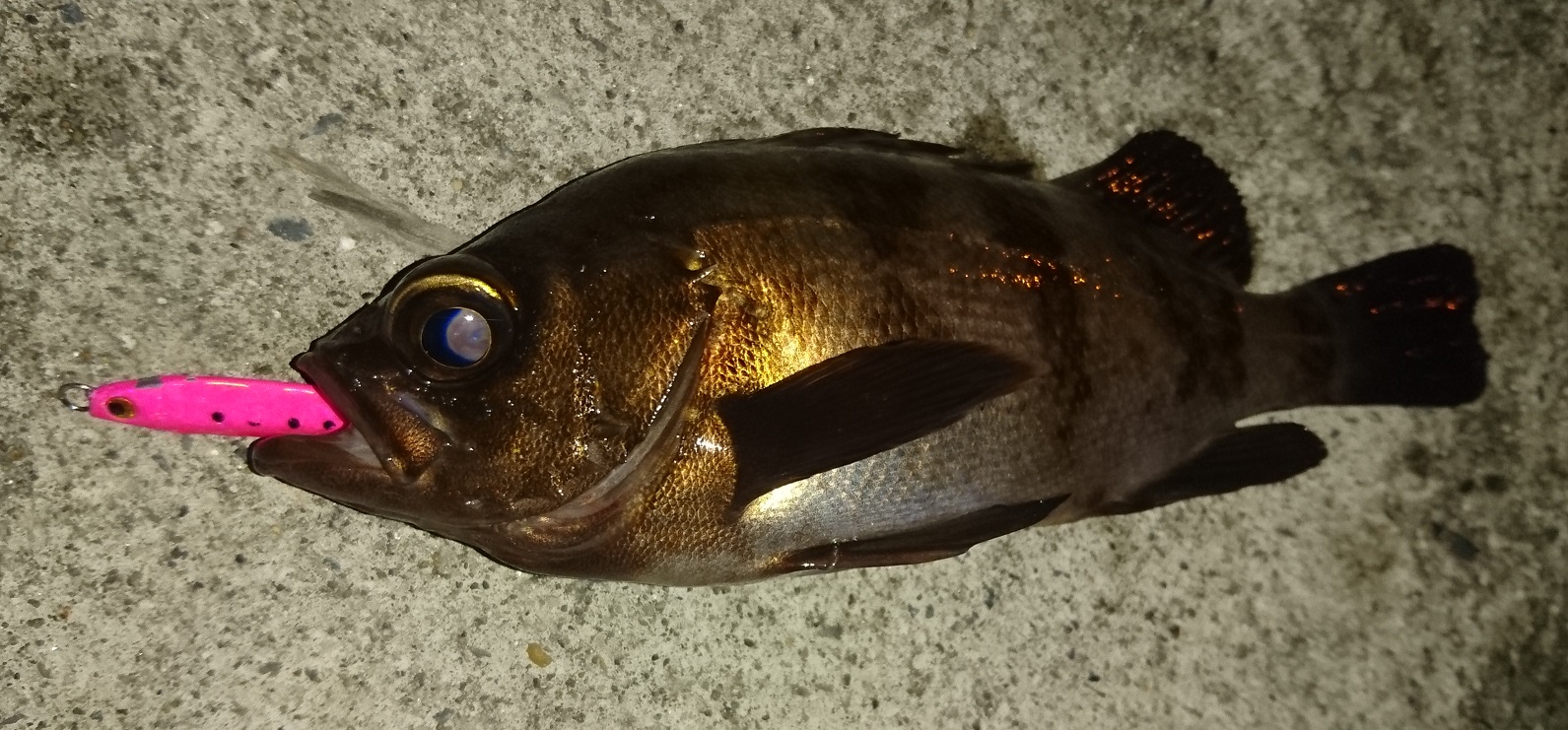 小型ですが、軽量ジグの遠投でメバルが釣れています。