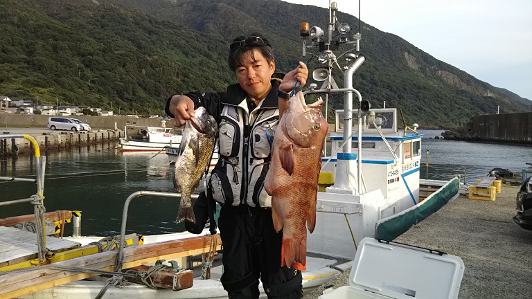 【磯釣り】 アオリイカ(1人:~60杯) メジナ(~33㎝)40~100匹 コブダイ(66㎝) クロダイ(45㎝) 【船釣り】 マダイ(~55㎝) アマダイ(~40㎝) ワラサ、ヒラメなど |