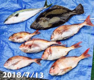 【7月13日】釣果情報【マダイ、ワラサ等】by 渡正in 船釣り、釣果情報on 投稿日: 2018年7月18日 魚種 マダイ/ヒラメ/ワラサ 日時 7月13日(金) 投稿者 三浦清一さん 場所 青森県砂ガ森沖 釣果 電気釣り ヒラメ75㎝ 真鯛6枚 40㎝〜60㎝ 使用アイテム シマノ インターライン200 コメント 他5名も大漁 真鯛、ブリワラサイズ二桁の人もびっくり ご投稿ありがとうございます! 皆さん、大漁だったのですね!!ヒラメも75センチと良型!おめでとうございます! またの投稿お待ちしております♪ 共有:FacebookX