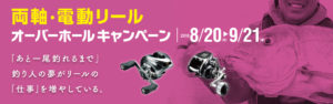 シマノ オーバーホールキャンペーンのお知らせby 渡正in お知らせ、イベント情報on 投稿日: 2018年8月23日 シマノの両軸・電動リールのオーバーホールキャンペーン実施中です! ※交換パーツ、見積のみの場合の手数料は含まれませんのでご了承ください。 + ※オーバーホール1台につき1枚差し上げます。 店頭にて受け付けておりますので、期間中にぜひお持ちください♪ 詳しくは シマノホームページ↓ http://fishing.shimano.co.jp/service/ohc2018-s/index.html 共有:FacebookX