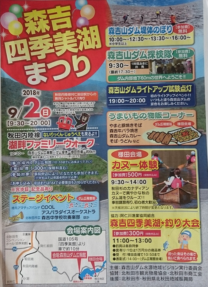 森吉四季美湖まつり♪by 渡正in イベント情報on 投稿日: 2018年8月28日 9月2日㈰ 森吉四季美湖まつりが開催されます♪ 楽しいイベントが盛りだくさん‼ 釣り大会もありますよ‼釣った魚はその場で食べられます♪ 週末はぜひ森吉へ(^^♪ 共有:FacebookX