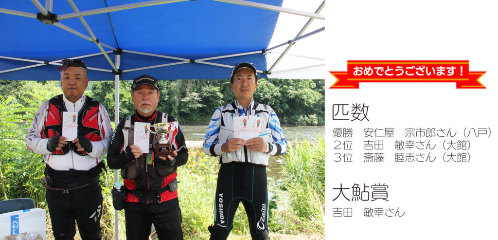 8月4日 渡正鮎釣り大会結果by 渡正in お知らせ、イベント情報on 投稿日: 2019年8月6日 8月4日(土) 米代川本流猿間で行われた第8回渡正鮎釣り大会の結果発表です。 優勝の安仁屋さんは22匹の鮎を釣りました! 大鮎賞の吉田さんの記録は23センチでした! みなさん暑い中のご参加ありがとうございました。 楽しい時間を過ごしていただけたでしょうか? またイベントがありまたらぜひご参加よろしくお願いします♪ 共有:FacebookX