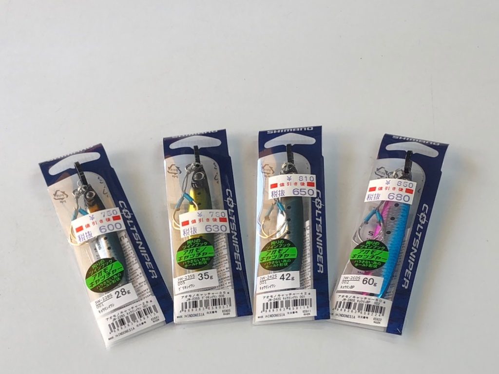 サワラ・サバなどに!アオモノキャッチャーby 渡正in ブログon 投稿日: 2019年8月27日2019年8月27日 シマノ アオモノキャッチャー各種 28g 600円 35g 630円 42g 650円 60g 680円 ※全て税抜表記です。 サワラ、サバなどに。2本セットのフックで魚が針から外れにくい。4種のサイズからお選びください。 こちら店内奥に陳列しております。 お知らせ 今季のジャリメの販売は終了しました。 イソメは取り扱いしております。 8月いっぱいで男鹿の撒き餌禁止期間が終了します。当店でも撒き餌用エサを取り扱っておりますのでご利用ください。 鮎の釣果情報も続々届いています。皆様の投稿もお待ちしております! 共有:FacebookX