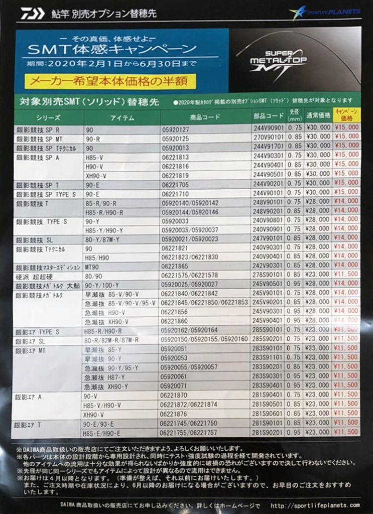 | 対象機種 | 2020年鮎カタログ掲載モデルの別売SMT(ソリッド)オプション替穂先