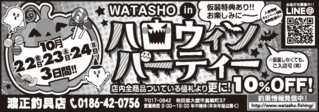 〜ハロウィンパーティーin渡正〜by 渡正in お知らせ、イベント情報、ブログon 投稿日: 2021年10月20日2021年10月21日 22日(金)〜24日(日)の3日間、 渡正釣具店ではハロウィンパーティーを開催し、 店内全商品を値札の価格から 10%off で販売致します!! 仮装しなくても入店できますが、仮装してきた方にはさらに特典をもらえるチャンスがあります。 特典の内容は当日のお楽しみ♪ 仮装は髭ひとつをつけたり、魔女の帽子をかぶったりなどの軽い仮装でも大丈夫です! 今週の三日間はぜひ渡正釣具店に足を運んでみてください♪ 共有:FacebookX