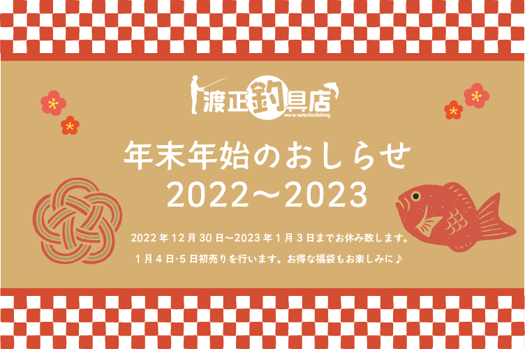 年末年始休業のお知らせby 渡正in お知らせ、ブログon 投稿日: 2022年12月19日2022年12月19日 平素は渡正釣具店をご愛顧頂き、誠にありがとうございます。 誠に勝手ながら、年末年始休業日を下記の通りとさせていただきます。 休業期間:2022年12月30日(金)‐ 2023年1月3日(火) 2023年1月4日(水)より通常営業いたします。 追記・・・2023年の秋田釣りカレンダー、まだ多少あります!! お早めにどうぞ😊 共有:FacebookX
